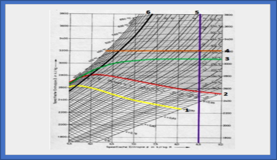 The Mollier diagram is used to analyze the performance of the adiabatic steady-flow process, one of which is to determine the work value and power of the Steam Turbine by looking for Enthalpy and Entropy in the system.