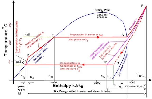 Superheated water vapor from the Boiler then enters the Steam Turbine to undergo the conversion of heat energy into motion energy. Water vapor has decreased Enthalpy during the conversion process of heat energy into motion energy, shown by the F-G line in the image above. The reduction in Enthalpy (h) can be used to calculate the amount of energy generated by the turbine using the following formula: