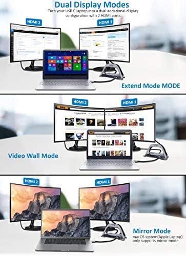 Type C Dual HD 1080P HDMI Monitors Dock: Features two HDMI ports and supporting SINGLE 4K@30Hz external displays and dual 1920X1080 resolution @ 60Hz refresh rate, so you can get 3 different screens(laptop screen + two external screens) and boost your productivity. Also can be used as a LAPTOP STAND when you close the laptop lid. NOTE: The dual monitor feature is not for the USB C macOS system.