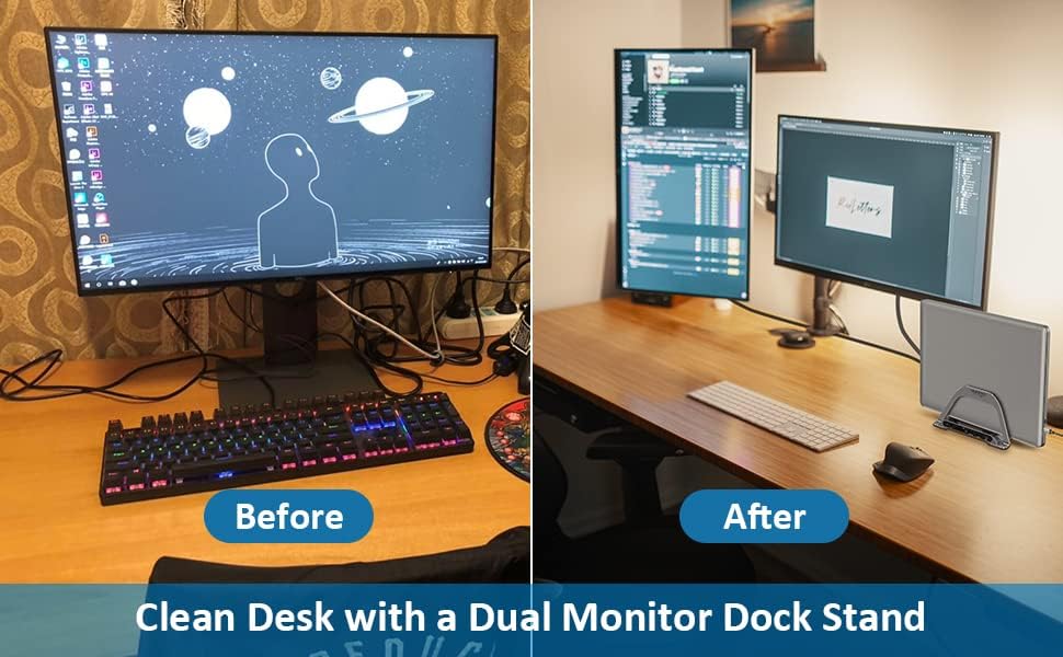 This 10 in 1 vertical stand & USB C Dock supports to connect to two external monitors, and support Extend Mode, Video Wall Mode, and Mirror Mode which features your need for immersive viewing. Also, the vertical stand design can hold your laptop over the docking station and let your desk cleaner than before.